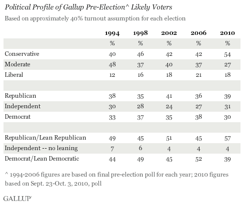 America is more Conservative today than we were when Newt Gingrich and the Freshmen Class of 1994 swept into Congress.  54% of likely voters proclaim Conservatism.  This is not very good news for President Barack Hussein Obama (mm mmm mmmm) and the Progressives.  Would you like some more proof?