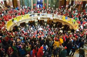 Within hours of the State Senate passing the bill, about 7,000 pouting Union members showed up outside the Senate Chamber, chanting: